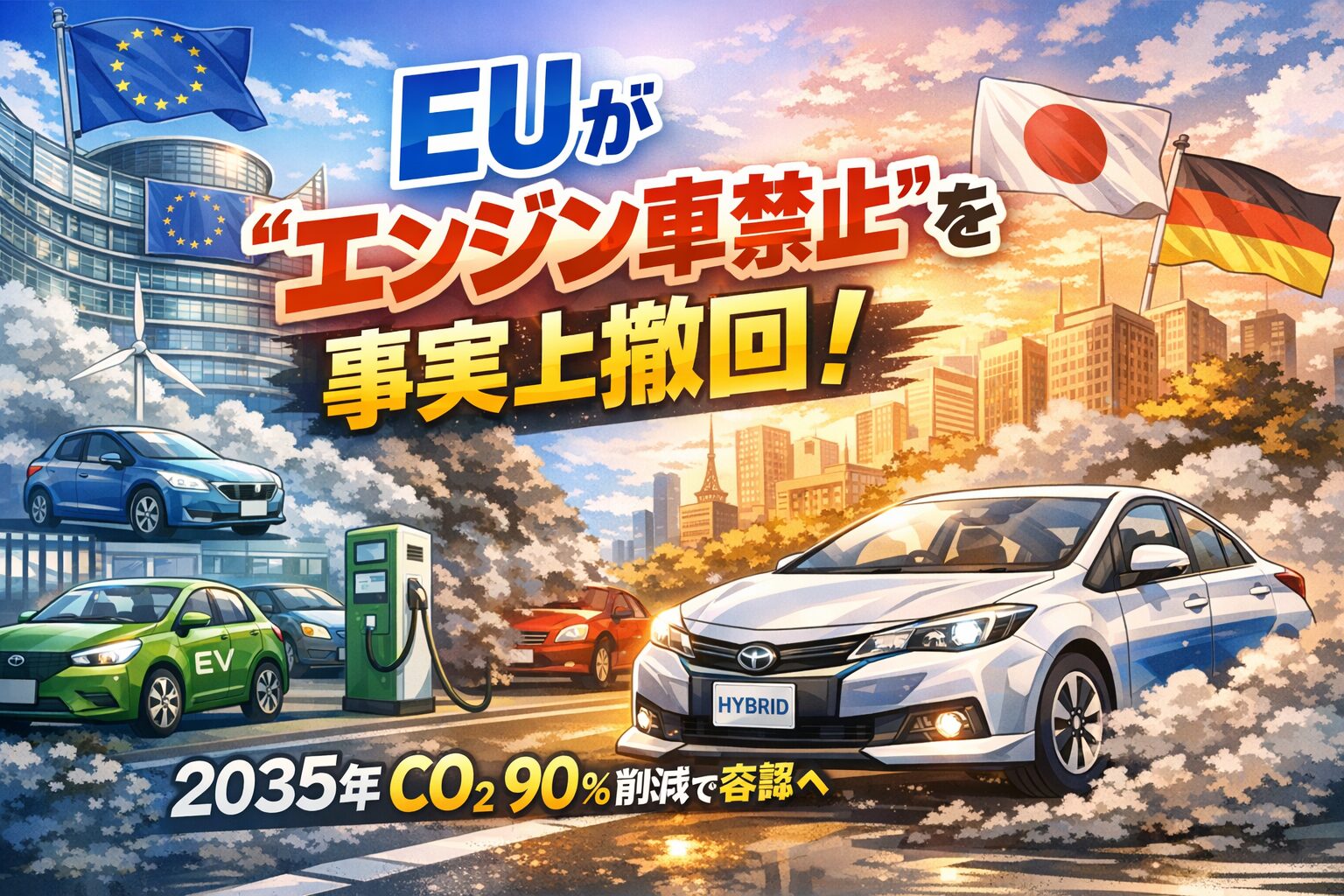 2025年12月17日、EU(欧州連合)が掲げてきた「2035年エンジン車新車販売禁止」方針を事実上撤回するという大きな政策転換が明らかになりました。