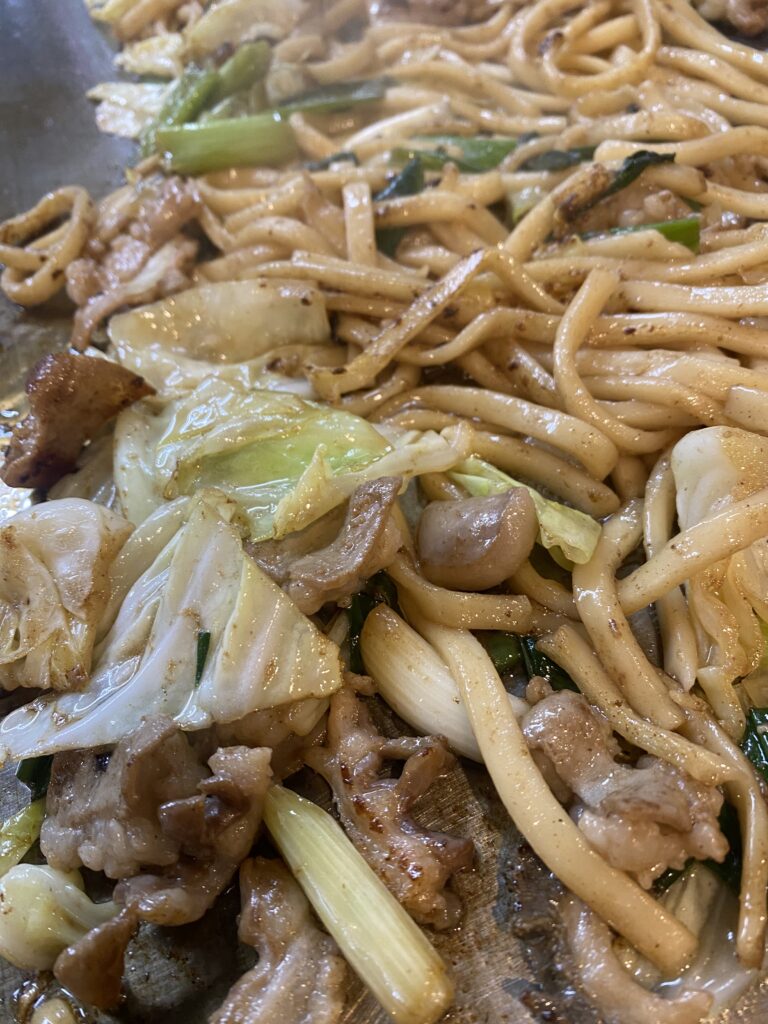 焼かれたうどんは表面がカリッと仕上がり、ホルモンの脂がしっかり絡んでいます。