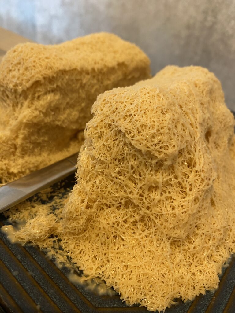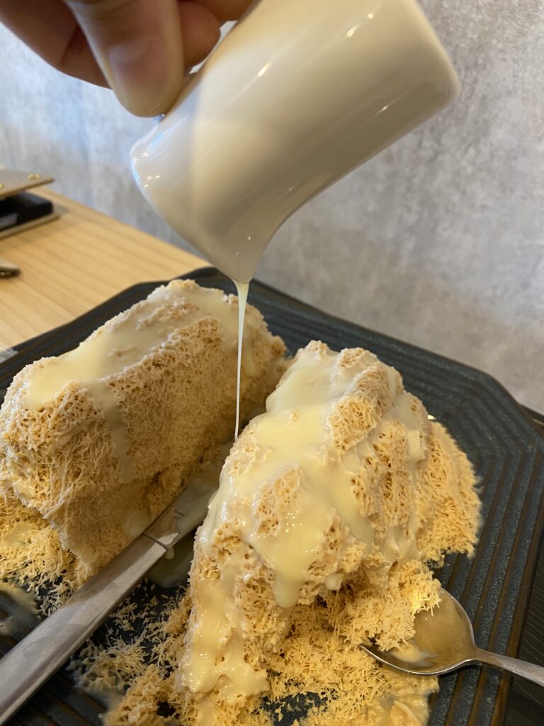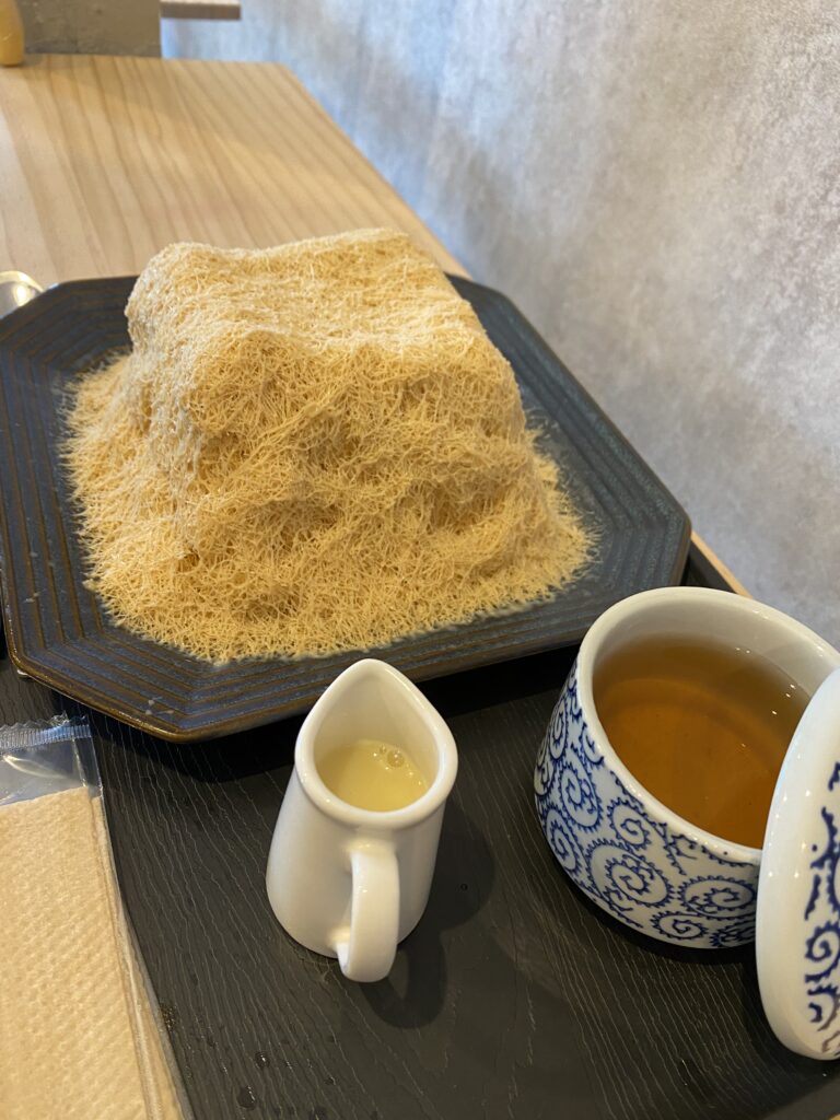 さらに驚いたのは、氷自体に味がついていること。普通のかき氷とは違い、ナイフでカットしながら食べる新感覚スイーツでした。見た目もユニークで、口に入れるとすぐに溶けるふわふわ感が本当にクセになります。