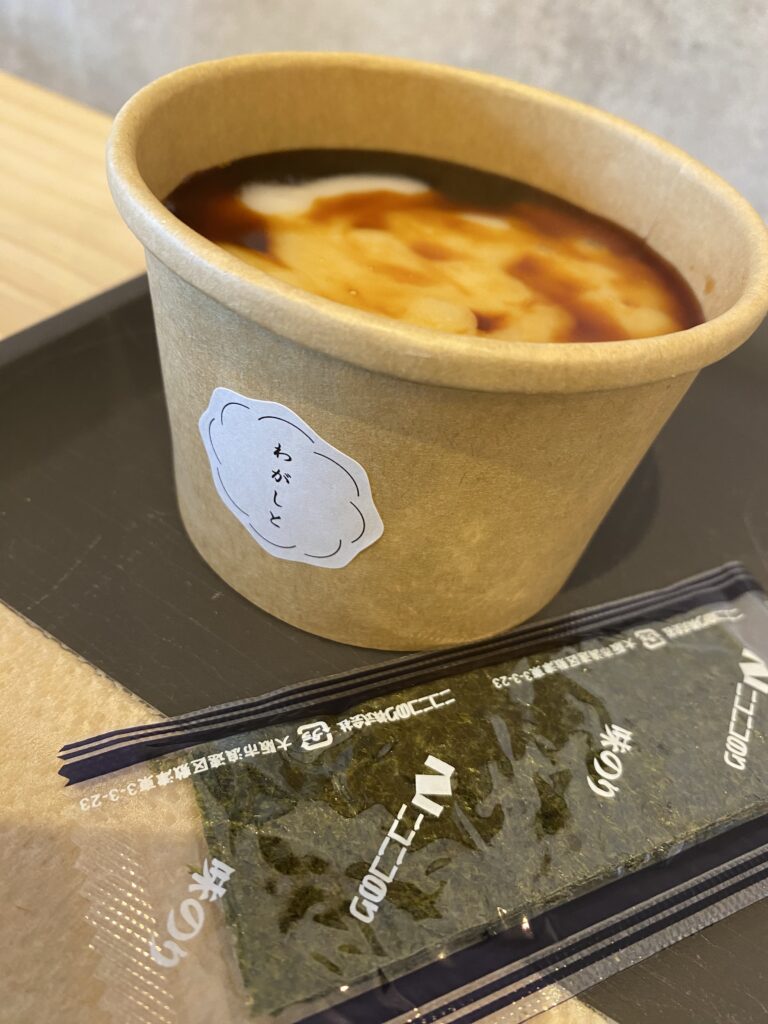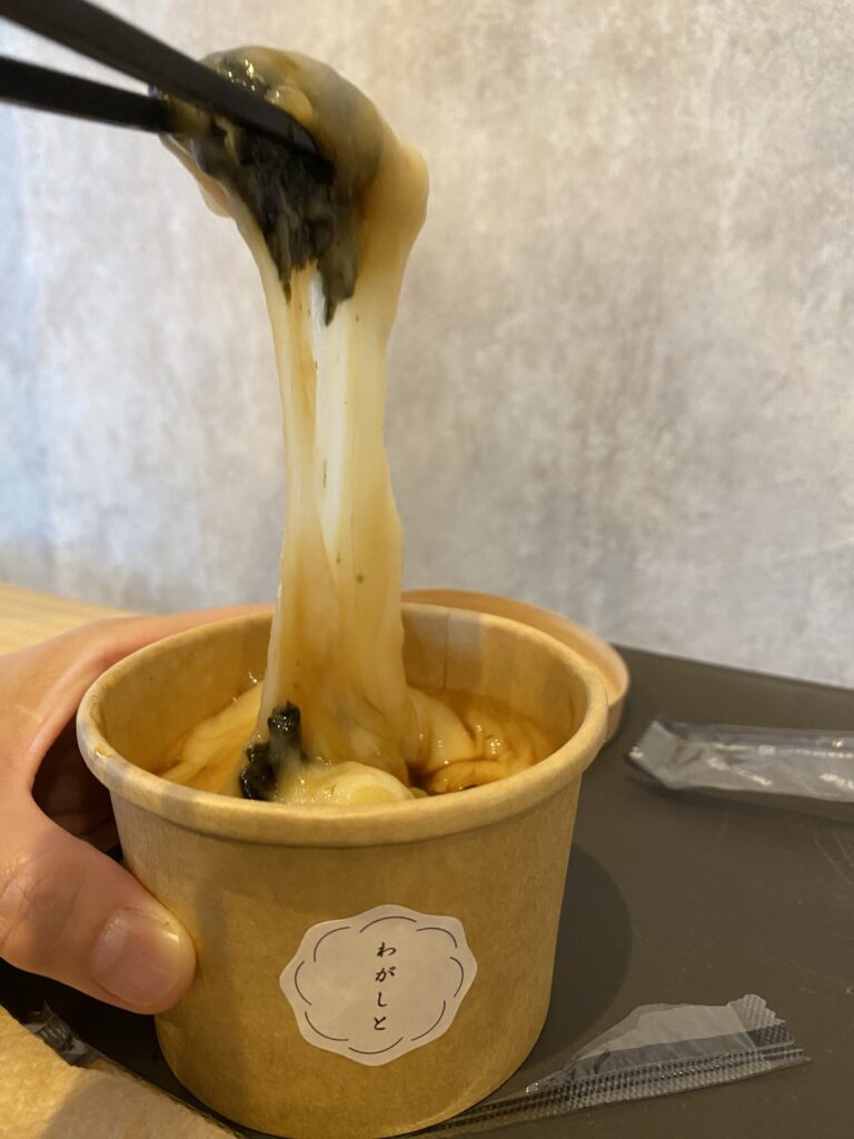 今回は磯部もちをいただきました。とても柔らかく伸びのあるお餅に、香ばしい海苔と醤油の風味がよく合い、まるで本当にその場でつきたてを食べているかのようでした。